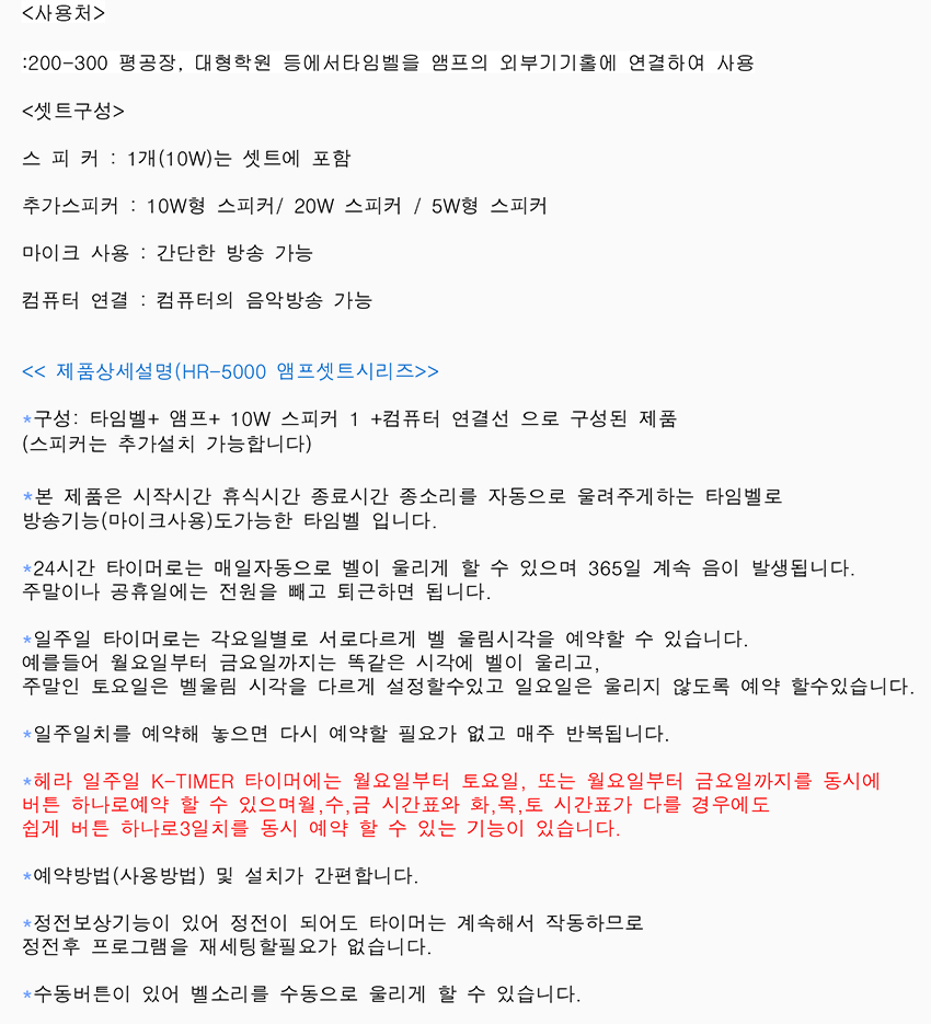 * 구성: 타임벨+ 앰프+ 10W 스피커 1 +컴퓨터 연결선 으로 구성된 제품